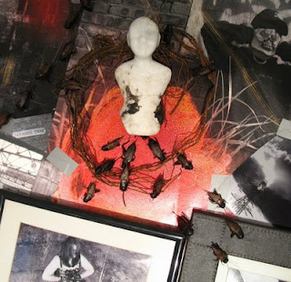 After completing the curating & hanging of the show I put my trusty rubber gloves on and reconstructed my Tattered and Stranded Boy display/installation of found items and photo collage. Quite different from the window installation in the King’s Lynn show, the porcelain figure now has many more dead crickets pouring out of its torso, and loads more of the pesky critters covering the enclosed cow jaw. Even managed to get the mini spotlight to work easily and shine upon the jaw to slightly expose the luminous paint around the teeth (and glowing cricket eyes).