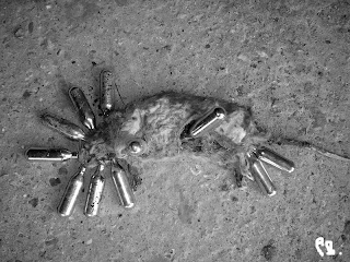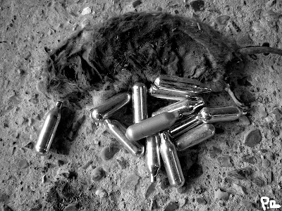 I whizzed down to the shed the next day, following a strange, erratic trail of silver pellets on the way down the road. Upon closer inspection, these glinting sliver bullets were clearly Nitrous Oxide canisters.